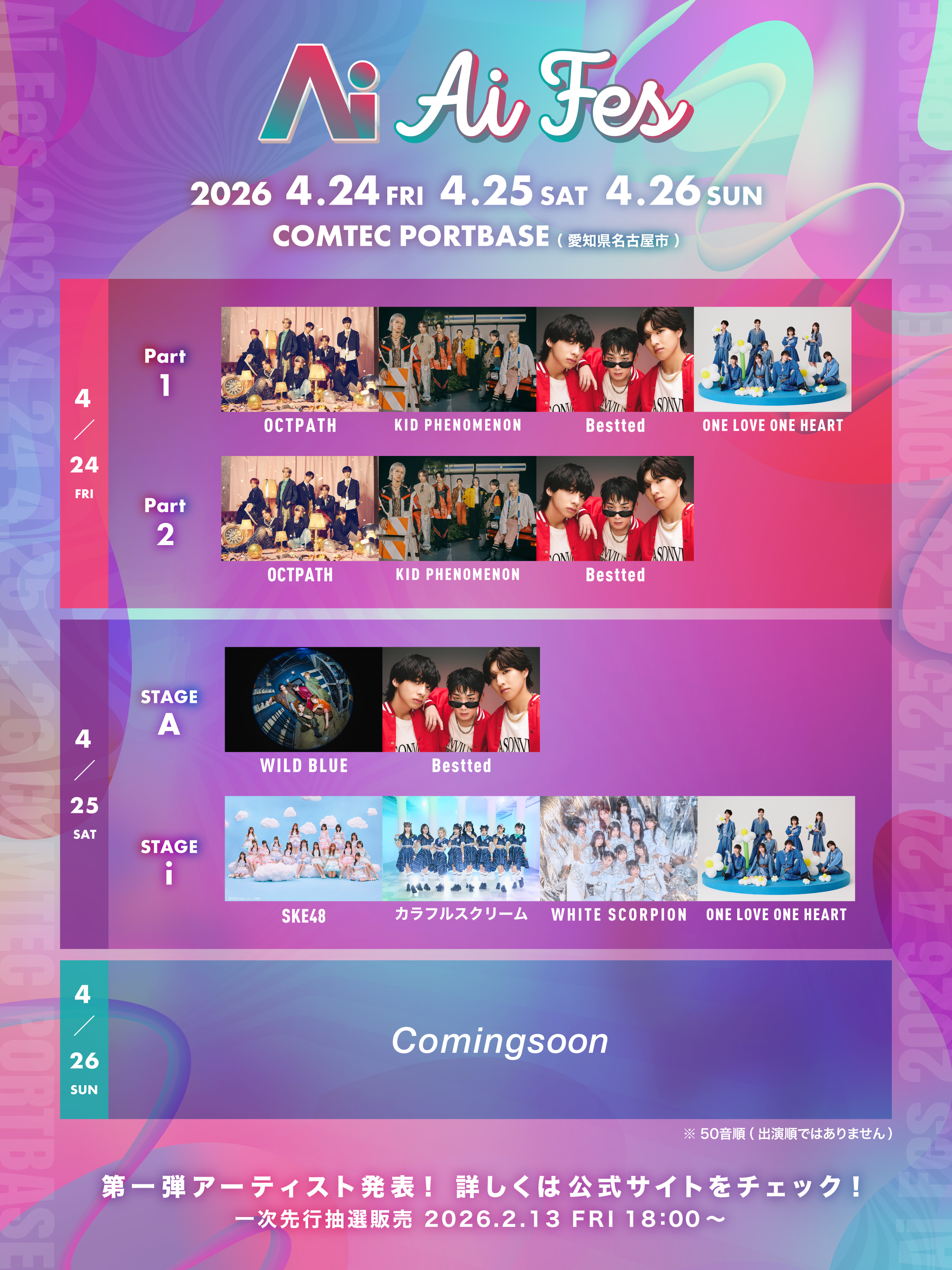 「Ai FES」4月24日(金)・25日(土)・26日(日)開催! 2026年2月13日 プレスリリース 2026年4月24日(金)・25日(土)・26日(日)の3日間、名古屋・COMTEC PORTBASEにて、次世代アーティストが集結する新音楽フェス「Ai FES」を開催!本フェスは、いま音楽シーンの最前線で注目を集めるアーティスト、そしてこれからの時代をアップデートしていく才能が一堂に会する音楽イベントです。名古屋から新たなカルチャーとムーブメントを発信する場として、3日間にわたり開催いたします。ライブハウス型ホールならではの距離感と熱量を活かし、来場者の皆さまに臨場感あふれる音楽体験を提供いたします。新しい音楽との出会いとともに、次世代シーンの可能性を体感いただける内容を予定!また、本フェスの模様はテレビ愛知の特別番組として後日オンエアを予定しております。 < 開催概要 > イベント名称:Ai FES 開催日:2026年4月24日(金)・25日(土)・26日(日) 会場:COMTEC PORTBASE(愛知県名古屋市) 主催:Ai FES実行委員会 企画:テレビ愛知/株式会社FAIR NEXT INNOVATION 制作:Makee(株式会社grabss) 公式サイト: Ai FES
